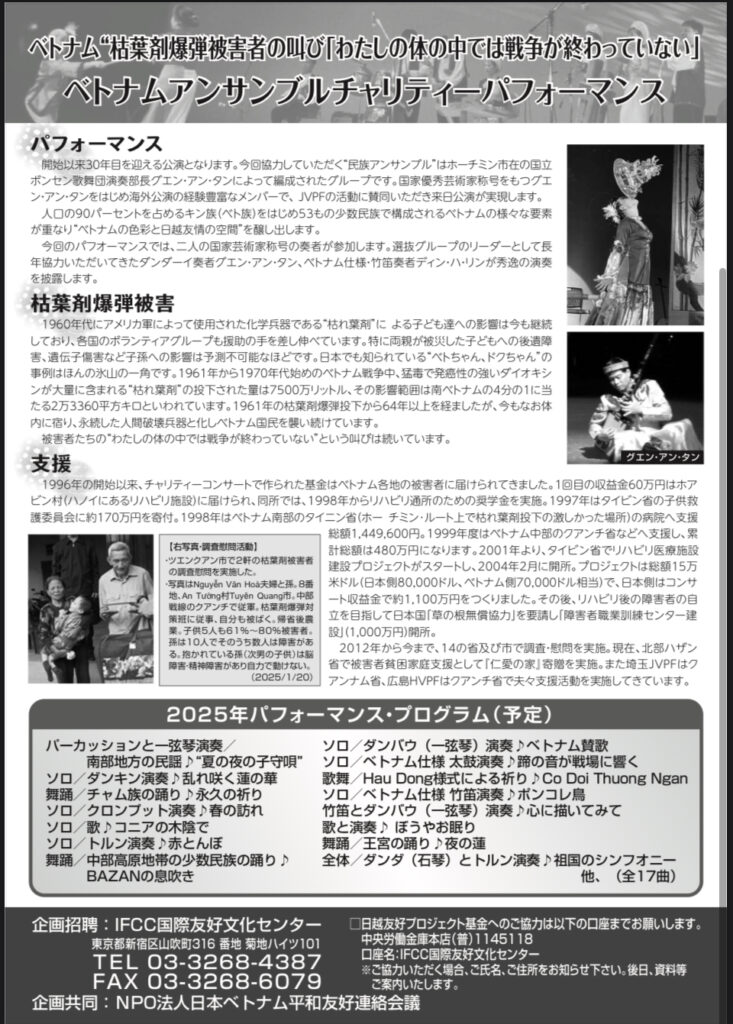 国分寺いずみホールにて、ベトナム戦争の枯葉剤被害者の支援、チャリティーコンサートがあります。